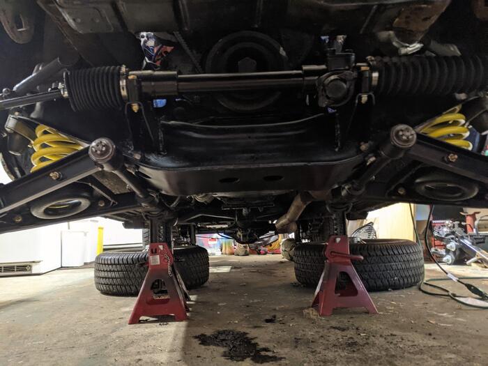 I can't believe it has been 2 weeks since I posted here, but I guess I've not made a ton of progress so it does sort of make sense. Camping and house projects have slowed the progress. but today I was able to sneak out to the garage and finished putting the steering rack back together and getting it installed. The whole slide the rack pinion into the knuckle joint was a pain, especially for one person. I think with a helper it might have gone easier.