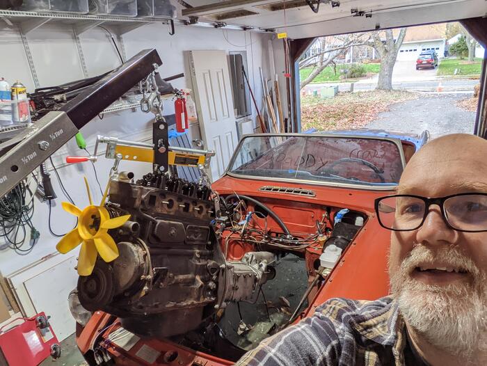 I and my daughter spent about 3 and a half hours doing to prep work on Friday afternoon. draining the fluids, removing the extra bits and getting it ready. This morning I spent about 2 hours setting up the hoist, removing the transmission brace and engine mounts and then lifting the whole big lump out. Overall with the support of the MGB forum and watching a couple of great videos online (David-Wilks and Endfloat) I felt it wasn't too bad a project.