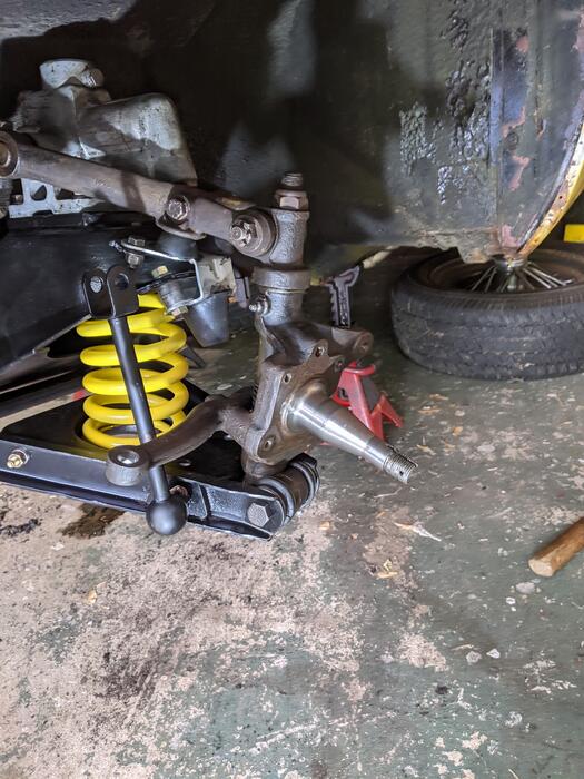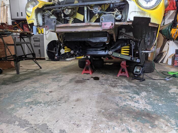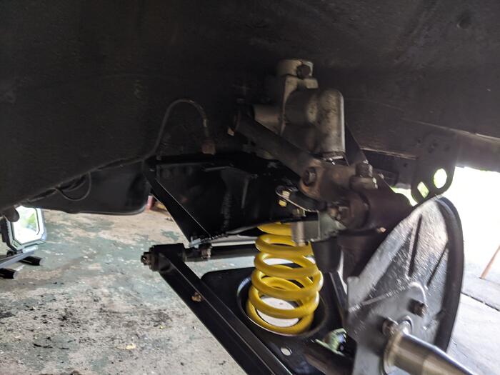 Life has been busy and it has slowed my progress a bit. However I've been slowly plugging away at the front end. I finally got most of the parts cleaned up or replaced and was able to start putting it back together. The main crossmember went in last weekend and this weekend I was able to get the springs and axels back on. The second time went a lot faster than the first time and the third time didn't take long at all. I'm pretty happy with the way this looks. I've still have the steering, wheel bearings, brakes and roll bar to get in. Maybe by the 4th but I wouldn't bet on it, The kids are out of school and camping season is here.