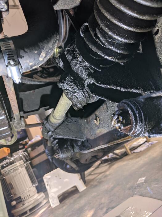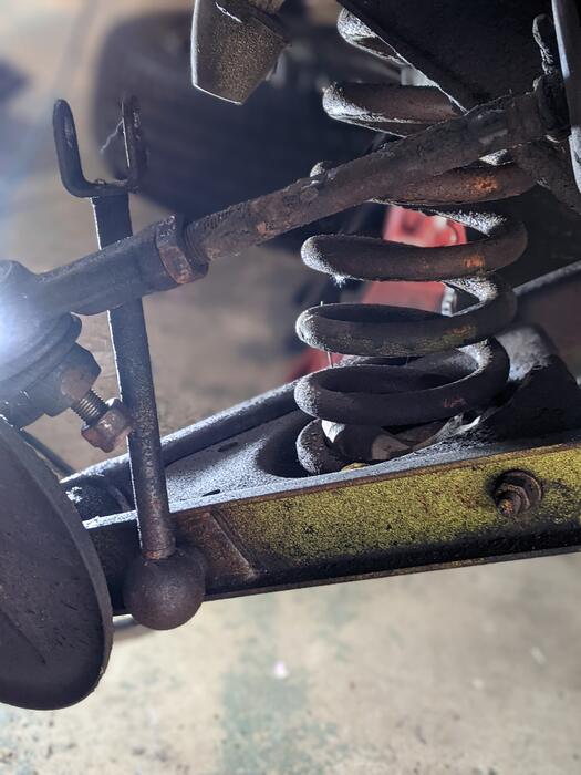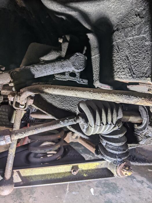 I started working on the front suspension this weekend. Oh what a mess, the grime is so thick I needed to scrape it off to find the bolts to try to loosen them. I was mostly successful as I was able to remove from the passenger side: