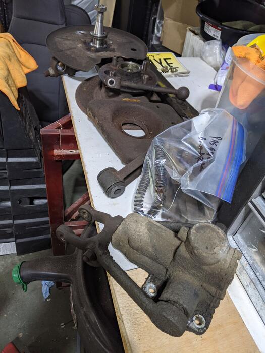 The wishbone arms are cleaned up and primed, I'll work on some of the other bits this week with the goal of getting it back together next weekend. I'm on the fence about dropping the front cross member. It certainly is nasty and needs to be cleaned up, but I'm not yet sure when else it will entail. More research needed.