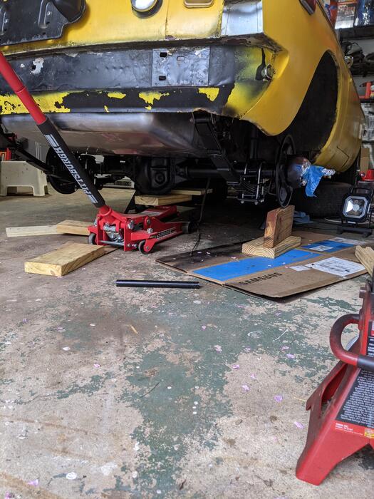 So that was pretty much the afternoon on Sunday. I did notice that I installed the bottom plate that attached to the shocks upside down and backwards so I'll flip those off and correct that. With that done I should only have to reattach the drive shaft and rear (broken) sway bar, shocks, brakes and wheels. Then I'll drop if down and tighten everything up..