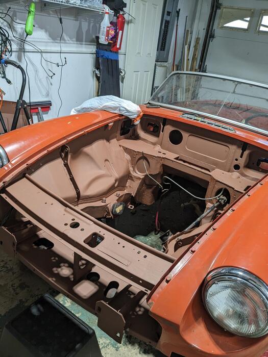 This last weekend I sanded and primed the engine bay. It is by far from perfect but is much better than it was before.
