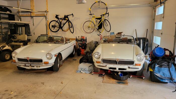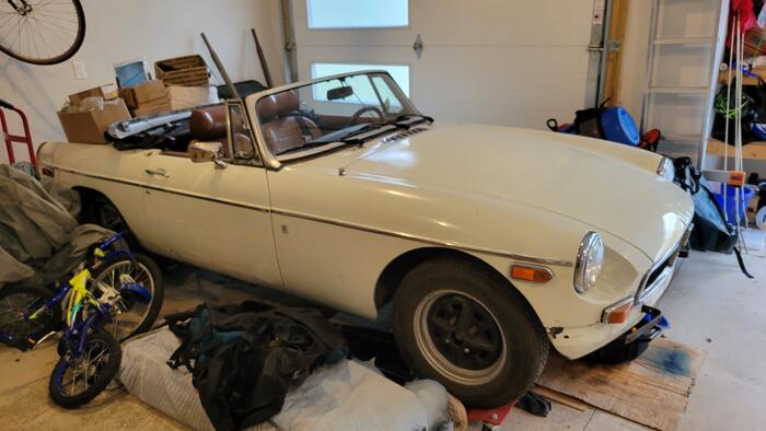 MGB #1 has been my running vehicle for a few years. It starts and drives well. Has the Weber carb conversion, wood steering wheel, new brake master cylinder, new clutch master and slave, rebuilt front suspension, rebuilt shock absorbers, newer tires, replacement seat belts, new battery, and more. Has a newer beige top that is in good shape.