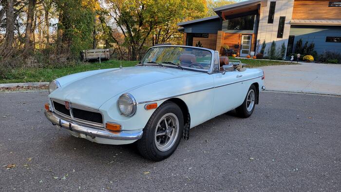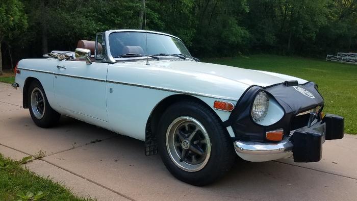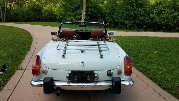 MGB #1 has been my running vehicle for a few years. It starts and drives well. Has the Weber carb conversion, wood steering wheel, new brake master cylinder, new clutch master and slave, rebuilt front suspension, rebuilt shock absorbers, newer tires, replacement seat belts, new battery, and more. Has a newer beige top that is in good shape.
